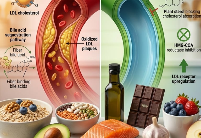 Here is what most people are never told: the most powerful dietary levers for lowering LDL cholesterol are not about what you remove. They are about what you add. Specific foods contain compounds that directly interrupt the biological pathway through which your body produces, retains, and deposits LDL cholesterol. Soluble fiber binds bile acids in the gut and forces the liver to pull LDL from circulation. Plant sterols physically block cholesterol absorption in the small intestine. Polyphenols protect LDL from the oxidation that transforms it from a neutral molecule into the arterial plaque–building form that causes heart attacks. Omega-3 fatty acids reduce the inflammation that drives cardiovascular damage independent of LDL levels entirely.