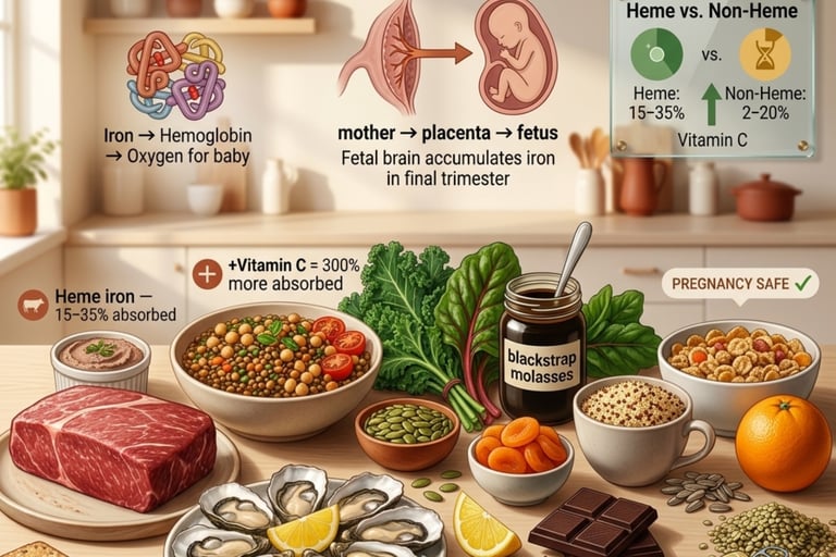 Iron deficiency affects 40% of pregnant women worldwide. Fetal brain development depends on it. 15 safe iron-rich foods, the vitamin C absorption rule, foods to avoid.